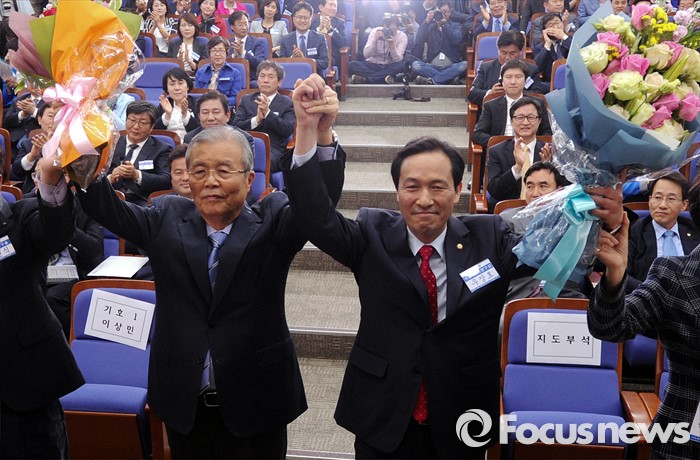 (서울=포커스뉴스) 4일 오후 서울 여의도 국회에서 더불어민주당 20대 국회 1기 원내대표 선출을 위한 당선자 총회에 참석한 김종인(오른쪽) 비대위 대표와 우상호 신임 원내대표가 취재진을 향해 포즈를 취하고 있다.