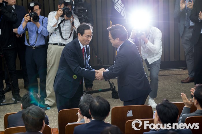 (서울=포커스뉴스) 우상호 더불어민주당 의원이 4일 오후 서울 여의도 국회에서 열린 원내대표선거에서 신임 원내대표로 선출된 뒤 결선투표까지 경합을 벌인 우원식 의원과 악수 하고 있다.
