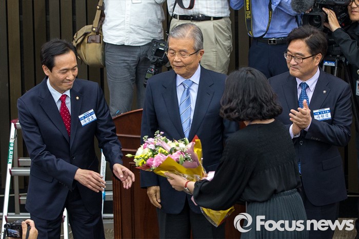(서울=포커스뉴스) 우상호(왼쪽) 더불어민주당 의원이 4일 오후 서울 여의도 국회에서 열린 원내대표선거에서 신임 원내대표로 선출된 뒤 꽃다발을 받고 있다.