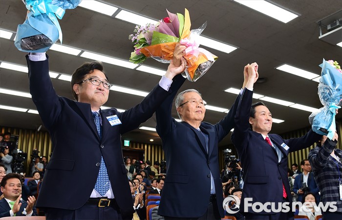 (서울=포커스뉴스) 4일 오후 서울 여의도 국회에서 더불어민주당 20대 국회 1기 원내대표 선출을 위한 당선자 총회에 참석한 김종인 비대위 대표와 우상호 신임 원내대표가 취재진을 향해 포즈를 취하고 있다. 왼쪽부터 경쟁 후보였던 우원식 의원, 김 대표, 우 신임 원내대표.