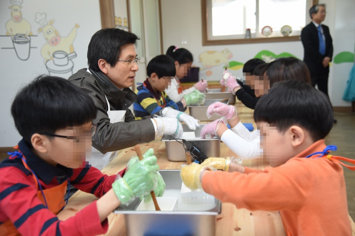 (세종=포커스뉴스)황교안 국무총리가 어린이날을 하루 앞둔 4일 오후 세종시 연서면 세종 꿈의목장을 방문, 어린이들과 치즈 만들기 체험을 하고 있다. <사진제공=국무총리실>