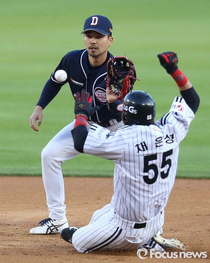 (서울=포커스뉴스) 4일 서울 잠실구장에서 열린 2016 프로야구 두산-LG 경기 1회말 2사후 중전안타로 진루한 LG 채은성이 히메네스 타석때 2루 도루에 성공하고 있다.