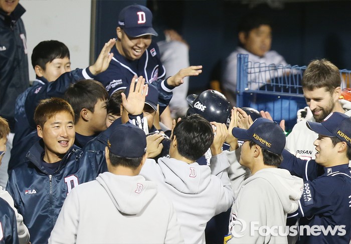 (서울=포커스뉴스) 4일 서울 잠실구장에서 열린 2016 프로야구 두산-LG 경기 5회초 2사 1,2루에서 두산 박건우가 좌월 3점 홈런을 치고 덕아웃에서 동료들의 축하를 받고 있다.