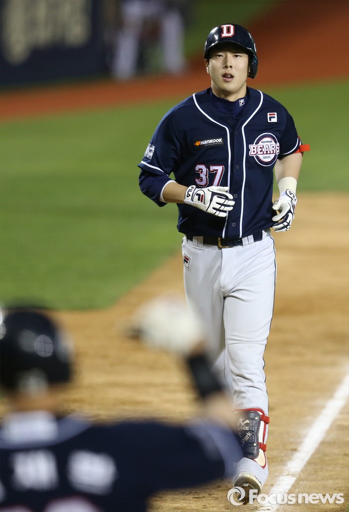 (서울=포커스뉴스) 4일 서울 잠실구장에서 열린 2016 프로야구 두산-LG 경기 5회초 2사 1,2루에서 두산 박건우가 좌월 3점 홈런을 치고 홈인하고 있다.
