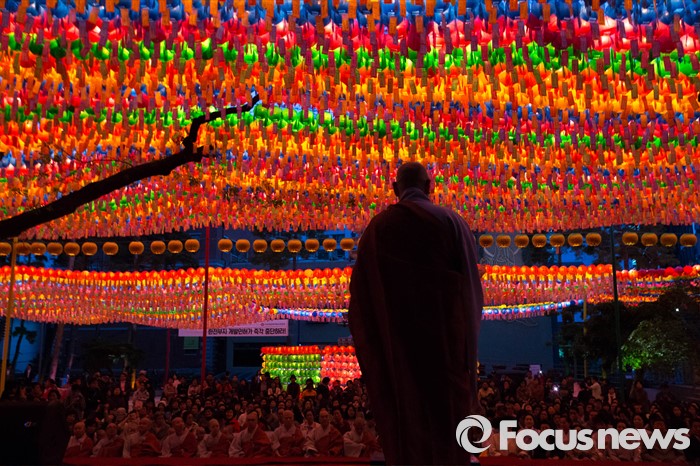 (서울=포커스뉴스) 4일 오후 서울 종로구 조계사에서 열린 연등 점등식에서 조계사 주지 스님이 축사를 하고 있다.