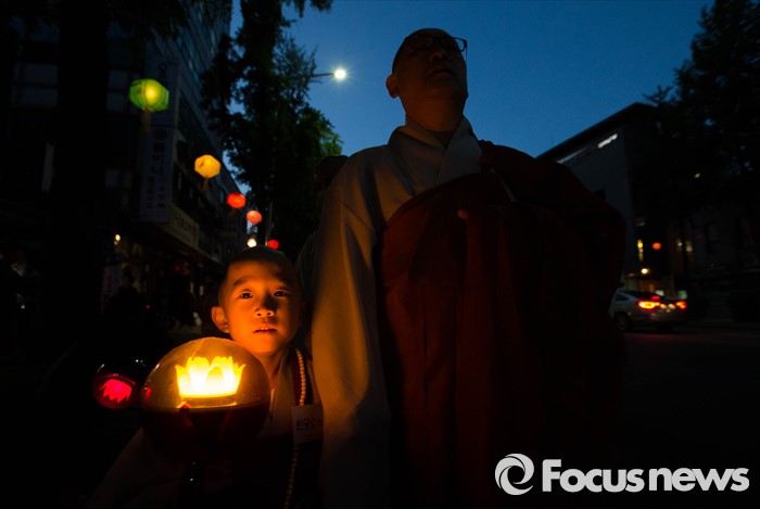 (서울=포커스뉴스) 조계사 스님과 동자승들이 4일 오후 서울 종로구 조계사에서 열린 연등 점등식이 끝나고 거리 행진을 하고 있다.