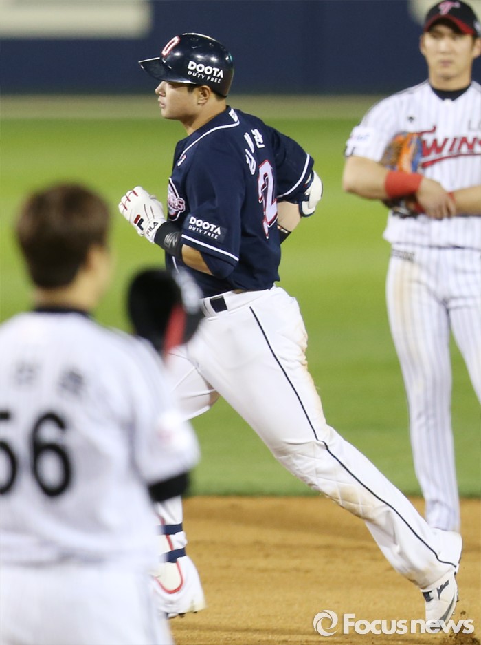 (서울=포커스뉴스) 4일 서울 잠실구장에서 열린 2016 프로야구 두산-LG 경기 6회초 1사 1,3루에서 두산 김재환이 우월 3점 홈런을 치고 베이스를 돌고 있다.