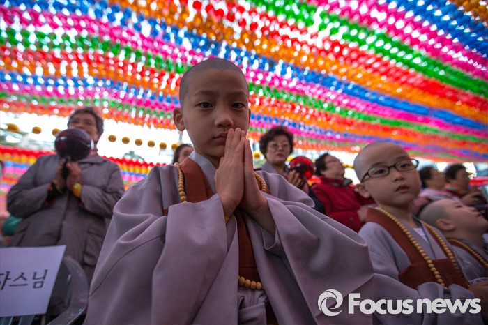 (서울=포커스뉴스) 4일 오후 서울 종로구 조계사에서 열린 연등 점등식 행사장에 동자승들이 참석해 있다.