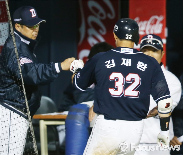 (서울=포커스뉴스) 4일 서울 잠실구장에서 열린 2016 프로야구 두산-LG 경기 9회초 2사후 두산 김태형 감독이 솔로 홈런을 치고 들어오는 김재환과 주먹을 마주치며 축하하고 있다.