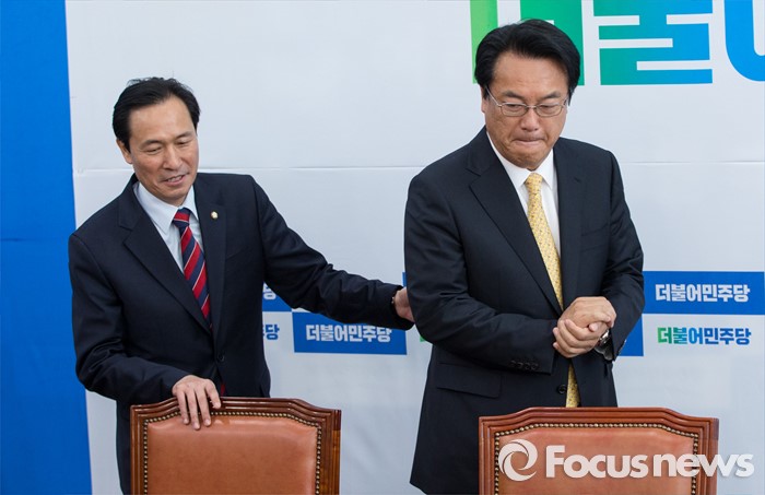 (서울=포커스뉴스) 5일 오전 서울 여의도 국회 더불어민주당 원내대표실을 예방한 정진석(오른쪽) 새누리당 신임 원내대표가우상호 더불어민주당 원내대표에게 자리를 안내받고 있다.