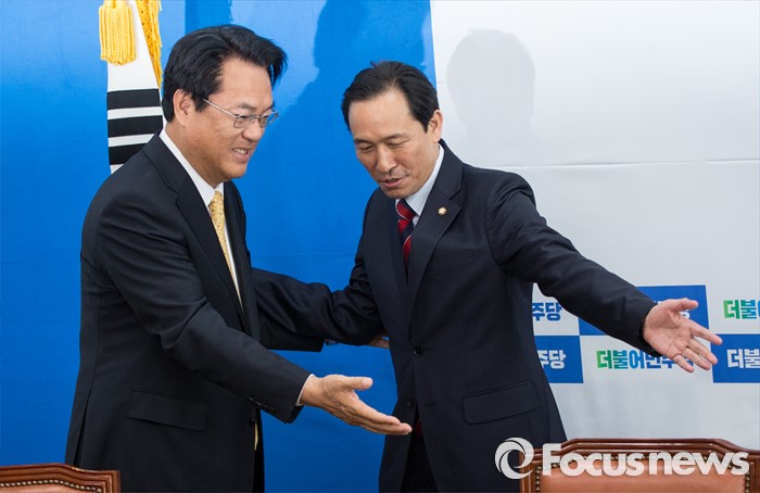 (서울=포커스뉴스) 정진석(왼쪽) 새누리당 신임 원내대표가 5일 오전 서울 여의도 국회 더불어민주당 원내대표실을 예방하여 우상호 더불어민주당 원내대표와 서로 자리를 양보하고 있다.