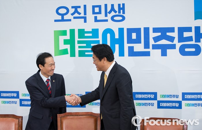(서울=포커스뉴스) 5일 오전 서울 여의도 국회 더불어민주당 원내대표실을 예방한 정진석(오른쪽) 새누리당 신임 원내대표가우상호 더불어민주당 원내대표와 인사를 나누고 있다.