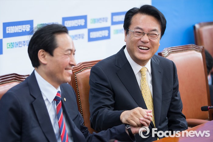 (서울=포커스뉴스) 정진석(오른쪽) 새누리당 신임 원내대표가 5일 오전 서울 여의도 국회 더불어민주당 원내대표실을 예방하여 우상호 더불어민주당 원내대표와 손을 잡고 있다.