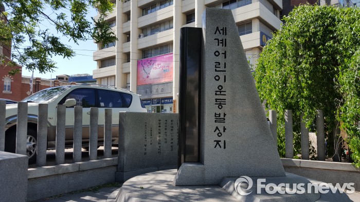 (서울=포커스뉴스) 서울 종로구 천도교 중앙대교당이 있는 수운회관 건물 앞에는 '세계 어린이운동 발상지'라고 적힌 기념비가 있다.