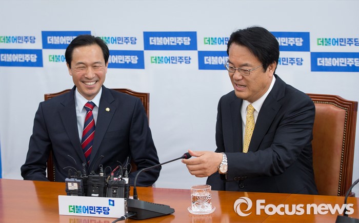 (서울=포커스뉴스) 정진석(오른쪽) 새누리당 신임 원내대표가 5일 오전 서울 여의도 국회 더불어민주당 원내대표실을 예방하여 우상호 더불어민주당 원내대표와 대화하고 있다.
