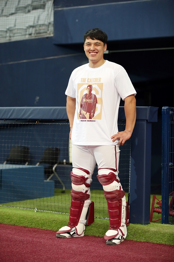 한편 넥센은 지난달 1일 롯데와의 개막전에서 서건창 미이지가 담긴 티셔츠를 무료 배포했다.프로야구 넥센이 6일 고척돔에서 열리는 KIA와의 경기에 선수 이미지가 담긴 티셔츠를 무료 배포하는 '영웅 프리티셔츠데이' 행사를 연다. 포수 박동원이 자신의 이미지가 새겨진 티셔츠를 입고 포즈를 취하고 있다. <사진제공=넥센 히어로즈>