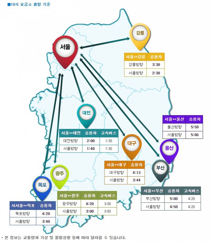 서울에서 주요도시까지 소요되는 시간은 오전 10시 기준 강릉 3시간 30분, 부산 5시간, 광주 4시간 20분, 목포 4시간 20분, 대전 2시간 등이다.
