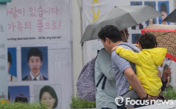 (서울=포커스뉴스) 임시공휴인인 6일 오후 서울 광화문광장을 지나는 어린이가 아빠 등에 업혀 비를 피하고 있다.