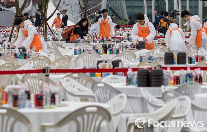 (서울=포커스뉴스) 6일 오후 서울 반포한강공원에서 열린 삼계탕 파티에서 행사 관계자들이 중국 건강보조제품 회사 중마이그룹 직원들이 앉을 자리를 준비하고 있다. 이날 한강공원을 찾은 4천여명의 중마이그룹 직원들은 삼계탕 파티와 태양의 후예 OST 미니 콘서트 등을 즐겼다.