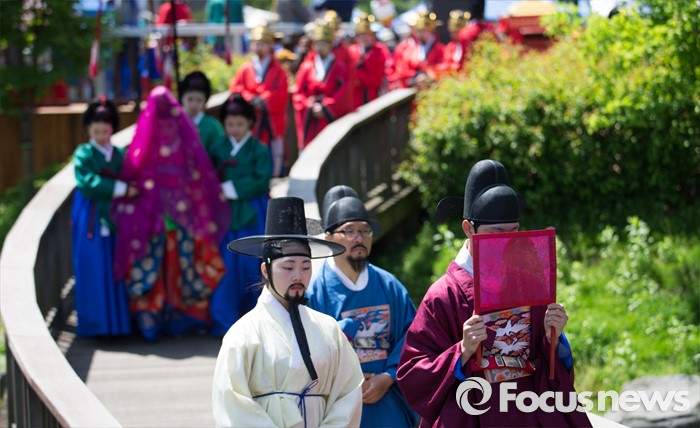 (서울=포커스뉴스) 7일 오전 서울 구로구 궁동저수지생태공원에서 '정선옹주 시집가는 날' 참가자들이 전통혼례를 재현하고 있다. 정선옹주는 조선 14대 임금인 선조와 후궁 정빈 민씨의 딸이다.
