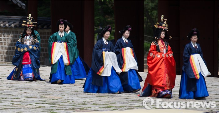 (서울=포커스뉴스) 7일 오후 서울 종묘 정전에서 열린 '조선의 세자빈 혼례를 고하다' 행사에서 참가자들이 묘현례를 재현하고 있다. 묘현례는 왕비나 세자빈이 왕실 혼례를 마친 후 조선왕조 역대 왕가 왕비의 신주가 모셔진 종묘를 알현하는 의례로서 조선시대 종묘에서 행해지는 국가의례 중 왕실 여성이 참여하는 유일한 행사이다.