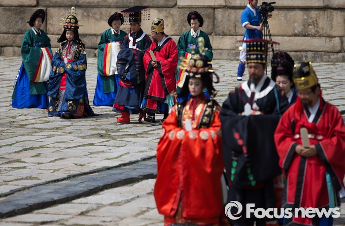 (서울=포커스뉴스) 7일 오후 서울 종묘 정전에서 열린 '조선의 세자빈 혼례를 고하다' 행사에서 참가자들이 묘현례를 재현하고 있다. 묘현례는 왕비나 세자빈이 왕실 혼례를 마친 후 조선왕조 역대 왕가 왕비의 신주가 모셔진 종묘를 알현하는 의례로서 조선시대 종묘에서 행해지는 국가의례 중 왕실 여성이 참여하는 유일한 행사이다.