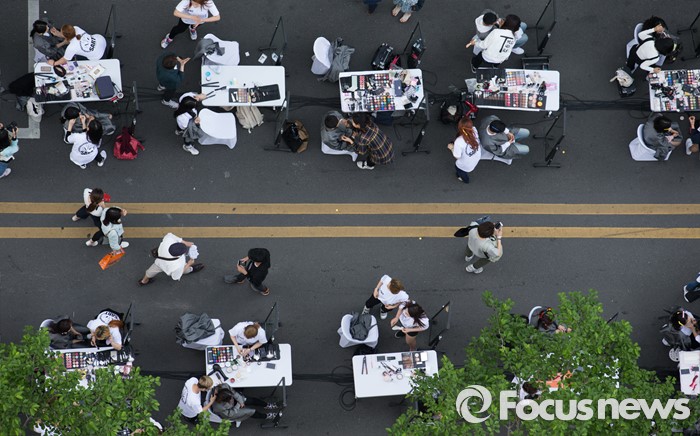 (서울=포커스뉴스) 7일 오후 서울 서대문구 신촌 차없는 거리에서 열린 제1회 신촌 뷰티 페스티벌 '뷰티체어 101' 행사 참가자들이 메이크업과 머리 손질을 받고 있다.