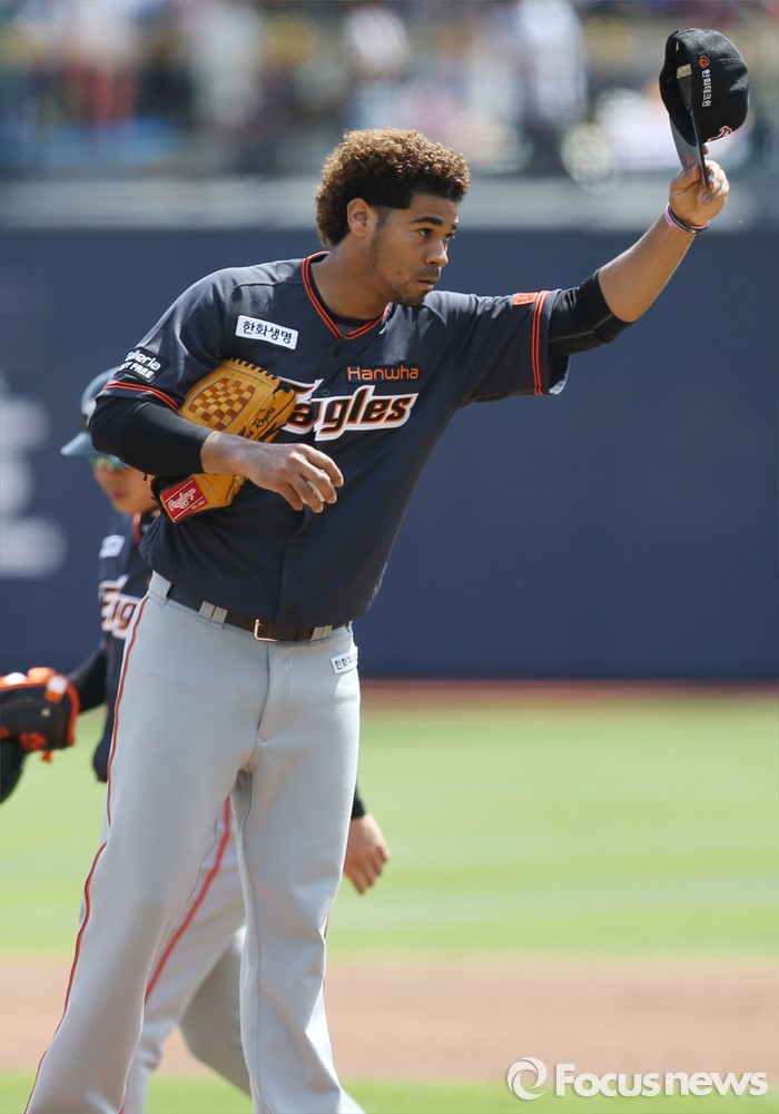 (서울=포커스뉴스) 8일 수원 kt위즈파크에서 열린 2016프로야구 한화-kt 경기에서 1회말 올 시즌 첫 등판한 한화 선발투수 로저스가 마운드에서 모자를 벗고 팬들에게 인사하고 있다.