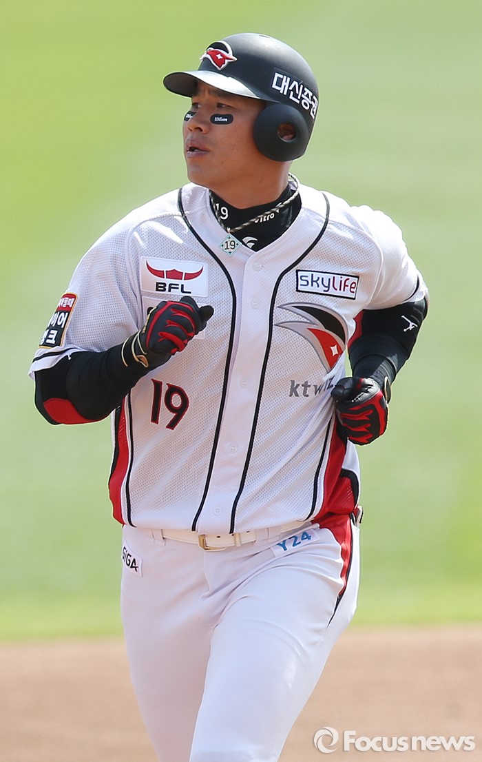 (서울=포커스뉴스) 8일 수원 kt위즈파크에서 열린 2016프로야구 한화-kt 경기 2회말 kt 김상현이 중월 솔로 홈런을 치고 베이스를 돌고 있다.