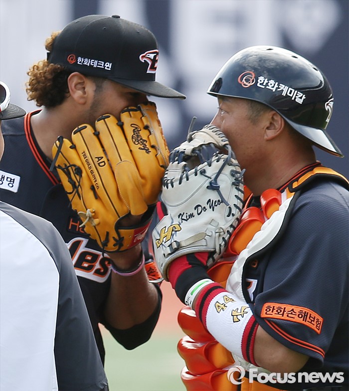 (서울=포커스뉴스) 8일 수원 kt위즈파크에서 열린 2016프로야구 한화-kt 경기에서 한화 투수 로저스와 포수 조인성이 글로브로 입을 가리고 대화하고 있다.