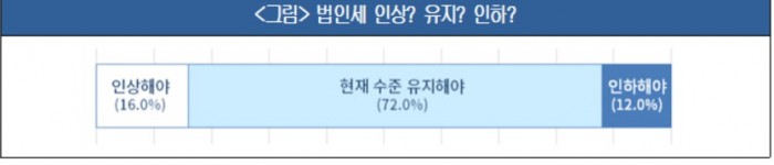 대한상공회의소가 9일 발표한 경제전문가(학계, 연구계 등) 50여명 대상 ‘경제현안에 대한 전문가 의견 조사’ 결과에 따르면, 전문가의 72.0%는 ‘법인세 현 수준 유지해야 한다’고 주장했고 고용과 투자확대를 위해 세계적인 인하경쟁에 합류해야 한다는 ‘인하론’도 12.0%에 달했다.
