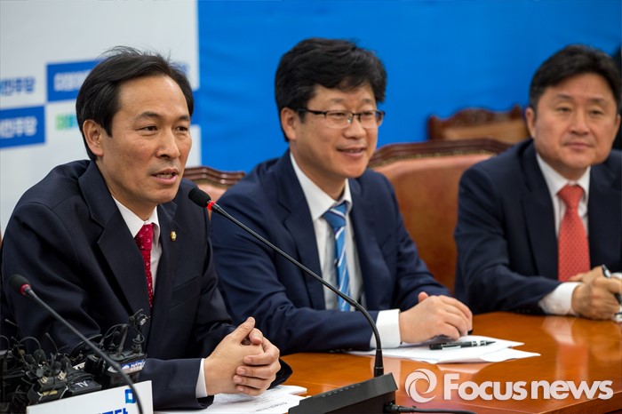 (서울=포커스뉴스) 우상호(왼쪽) 더불어민주당 원내대표가 9일 오전 서울 여의도 국회에서 열린 신임 원내대표단 회의에서 모두발언 하고 있다.