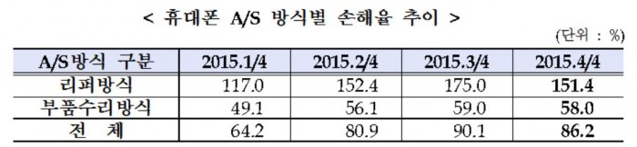 금감원이 집계한 휴대전화 사후 수리 방식별 손해율을 보면 작년 리퍼 방식의 보험료 평균 손해율은 148.95% 였으며 부품 수리 방식의 보험료 평균 손해율은 55.55%다. 이 기간 전체 휴대전화 보험료 평균 손해율은 80.35%다.
