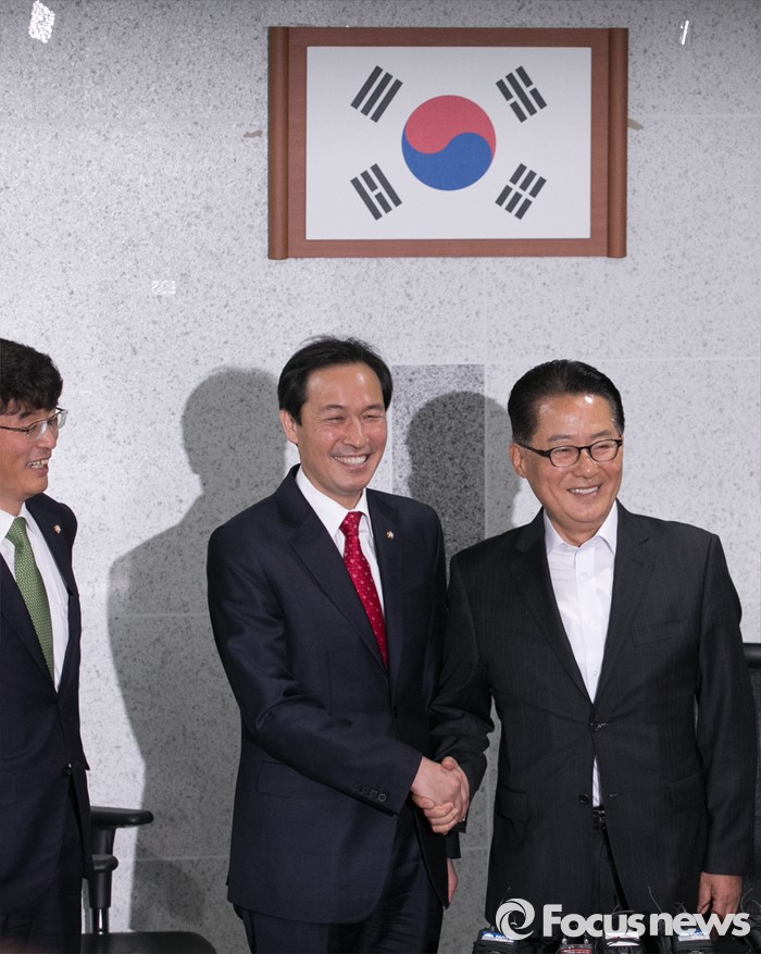 (서울=포커스뉴스) 우상호(가운데) 더불어민주당 원내대표가 9일 오전 서울 여의도 국회 의원회관에서 박지원(오른쪽) 국민의당 원내대표를 예방, 취재진을 향해 포즈를 취하고 있다. 왼쪽은 박완주 더민주 원내수석부대표.