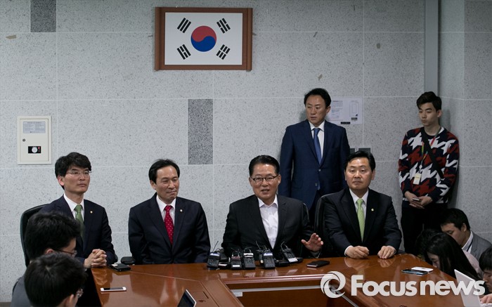 (서울=포커스뉴스) 우상호 더불어민주당 원내대표가 9일 오전 서울 여의도 국회 의원회관에서 박지원 국민의당 원내대표를 예방, 면담을 하고 있다. 왼쪽부터 박완주 더불어민주당 원내수석부대표, 우상호 원내대표, 박지원 국민의당 원내대표, 김관영 원내수석부대표.