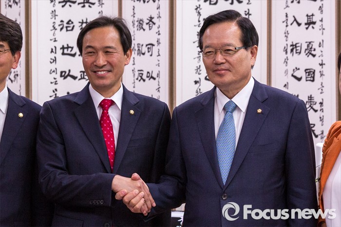 (서울=포커스뉴스) 정의화(오른쪽) 국회의장과 우상호 더불어민주당 원내대표가 9일 오전 서울 여의도 국회에서 면담에 앞서 악수 하고 있다.