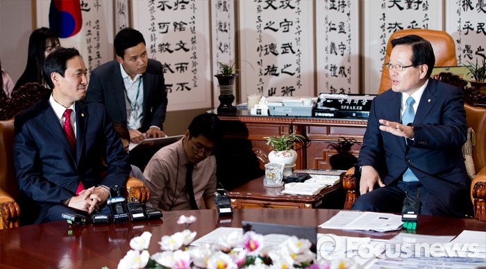 (서울=포커스뉴스) 정의화(오른쪽) 국회의장이 9일 오전 서울 여의도 국회에서 우상호 더불어민주당 원내대표와 면담 하고 있다.