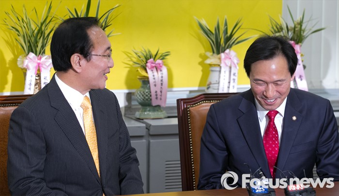 (서울=포커스뉴스) 우상호(오른쪽) 더불어민주당 원내대표가 9일 오전 서울 여의도 국회에서 노회찬 정의당 원내대표를 예방, 면담을 하고 있다.