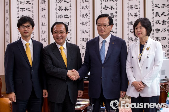 (서울=포커스뉴스) 정의화(왼쪽 두 번째) 국회의장이 9일 오후 서울 여의도 국회에서 노회찬 정의당 원내대표를 비롯한 신임 원내대표단과 면담에 앞서 악수 하고 있다.