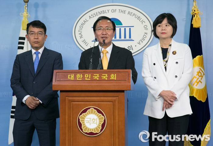 (서울=포커스뉴스) 노회찬 정의당 원내대표가 9일 오후 서울 여의도 국회 정론관에서 원내 당직 인선 발표 기자회견을 하고 있다. 왼쪽부터 원내대변인으로 임명된 김종대 비례대표 당선인, 노 원내대표, 원내수석부대표로 임명된 이정미 비례대표 당선인.