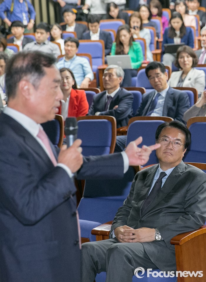 (서울=포커스뉴스) 9일 오후 서울 여의도 국회에서 열린 새누리당 20대 총선 당선자 총회에 참석한 정진석 원내대표 등 당선인 및 의원들이 노무현 정부 청와대 정책실장을 지낸 김병준 국민대 교수의 특강을 듣고 있다.