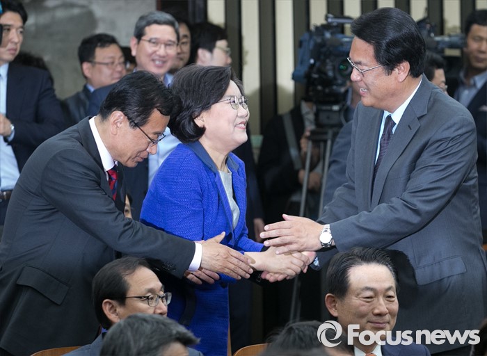 (서울=포커스뉴스) 9일 오후 서울 여의도 국회에서 열린 새누리당 20대 총선 당선자 총회에 참석한 정진석(오른쪽) 원내대표와 이혜훈(가운데) 당선인, 이현재 의원과 인사하고 있다.