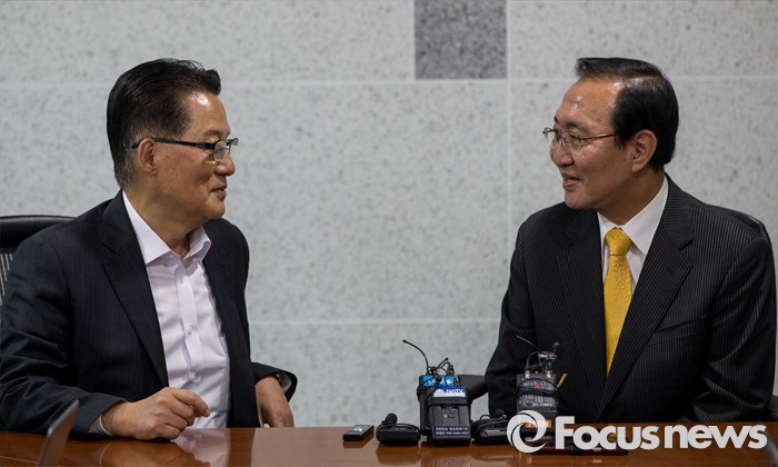 (서울=포커스뉴스) 박지원(왼쪽) 국민의당 원내대표와 노회찬 정의당 원내대표가 9일 오후 서울 여의도 국회에서 면담하고 있다.