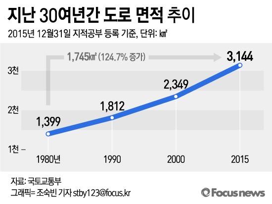 (서울=포커스뉴스) 국토교통부가 10일 발간하는 '2016년 지적통계연보'에 따르면 지난 30여년간 도로 면적은 1,399㎢에서 3,144㎢로 1,745㎢ 증가한 것으로 나타났다.