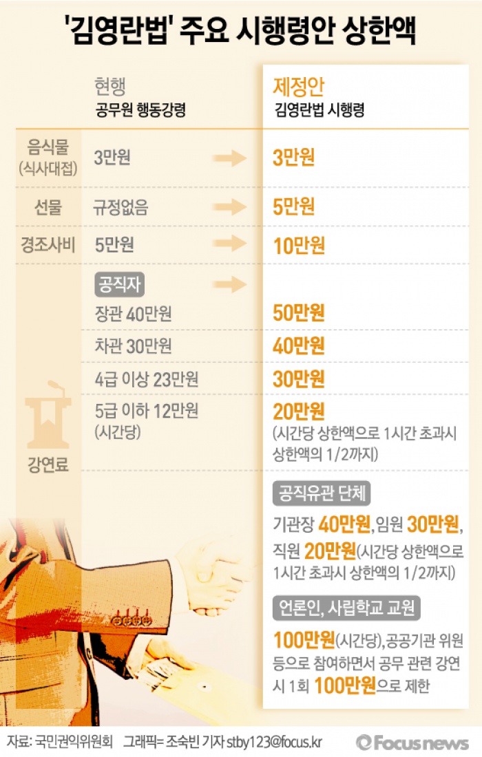 (서울=포커스뉴스) 공직자와 언론사 임직원, 사립학교 및 유치원 임직원, 사학재단 이사장과 이사는 직무 관련성이 있거나 또는 대가성이 없어도 음식물은 3만원, 선물은 5만원, 경조사비는 10만원 이상을 제공받게 될 경우 처벌받게 된다.