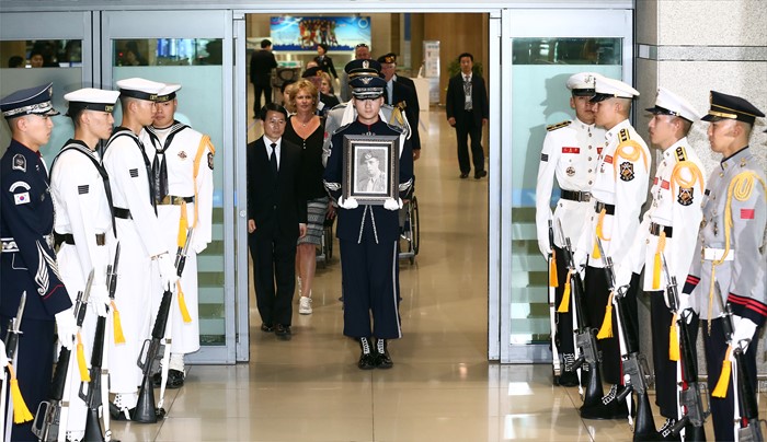 (서울=포커스뉴스) 부산 UN기념공원에 안장을 희망한 6.25전쟁 네덜란드 참전용사 故 니콜라스 프란스 웨셀(Nicolas Frans Wessels)씨의 유해가 9일 오후 인천국제공항에서 운구되고 있다. 6·25전쟁에 네덜란드 반호이츠 부대원(일병)으로 참전한 故 니콜라스 프란스 웨셀씨는 1953년 11월에 한국을 떠났지만 자신이 목숨바쳐 지켰던 한국에 대한 애정이 아주 컸으며, 평소 부산 UN기념공원에 묻힌 전우들을 그리워하다 지난해 4월 7일 "한국에 있는 전우들 곁에 잠들게 해 달라"는 유언을 남긴 채 향년 84세의 일기로 삶을 마감했다. 지난해 5월 부산 UN기념공원에 프랑스 참전용사 故 레몽 베나르씨가 사후 안장 실시된 이후 4번째인 웨셀 씨는 오는 12일 오전 부산UN기념공원에 안장된다. <사진제공=국가보훈처>