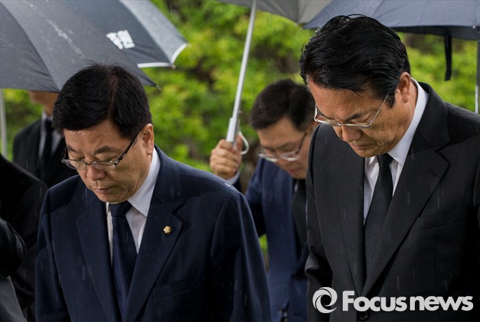 (서울=포커스뉴스) 10일 오전 서울 동작구 국립현충원을 찾은 정진석(오른쪽) 새누리당 신임 원내대표와 김광림 신임 정책위의장이 묵념하고 있다.
