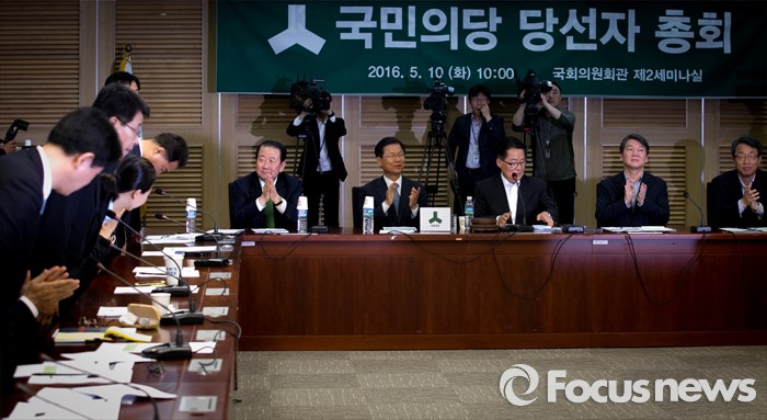 (서울=포커스뉴스) 국민의당 지도부가 10일 오전 서울 여의도 국회 의원회관에서 열린 당선자 총회 및 3차 집중워크숍에 참석해 인준이 처리된 원내 당직자들에게 박수를 보내고 있다. 오른쪽부터 김성식 정책위의장, 안철수 상임공동대표, 박지원 원내대표, 천정배 공동대표, 박주선 최고위원.