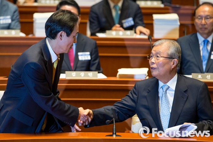 (서울=포커스뉴스) 김종인(오른쪽) 더불어민주당 비상대책위 대표와 우상호 원내대표가 10일 오전 서울 여의도 국회에서 열린 초선 당선자 워크숍에 참석해 악수 하고 있다.