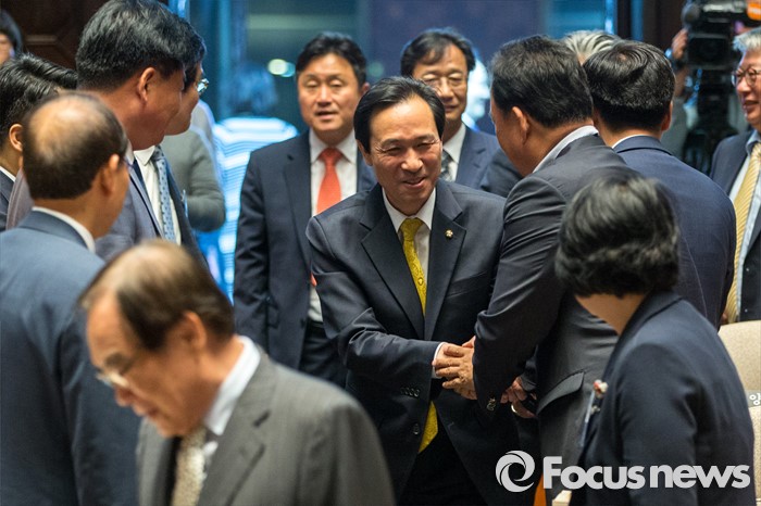 (서울=포커스뉴스) 우상호 더불어민주당 원내대표가 10일 오전 서울 여의도 국회에서 열린 초선 당선자 워크숍에서 초선 당선자들과 악수하고 있다.